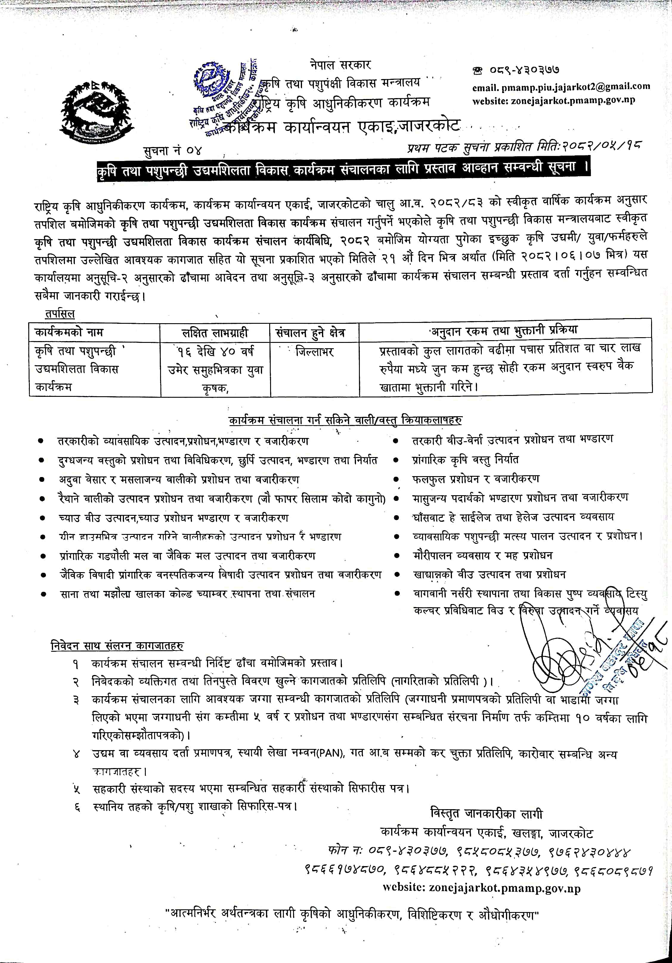 | कृषि तथा पशुपंछी उद्यमशीलता कार्यक्रमको प्रस्ताव आह्वान सम्बन्धी सूचना | 2082-05-19 | हेर्नुहोस् | डाउनलोड |